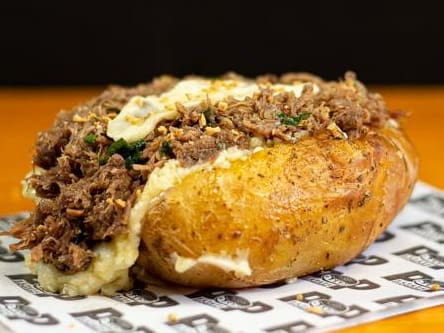 Batata grande própria para recheio, assada ao forno recheada com purê da batata, muçarela, costela bovina desfiada e alho frito