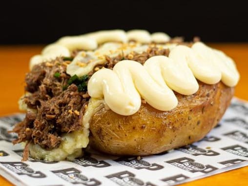 Batata grande própria para recheio, assada ao forno recheada com requeijão cremoso, muçarela, costela bovina desfiada, finalizada com alho frito