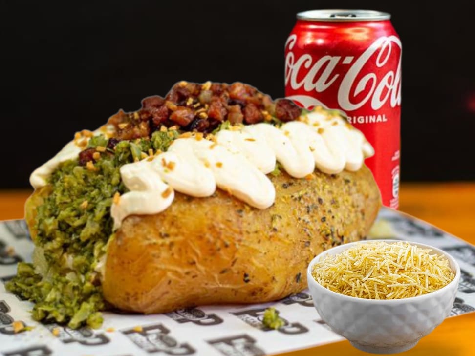 Deliciosa batata recheada com purê da batata, requeijão cremoso, brócolis temperado na manteiga, bacon em cubos, alho frito e batatinha palha para acompanhar e + 1 bebida 350ml