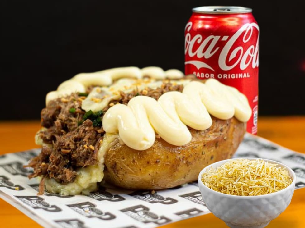 Batata recheada com a purê de batata, muçarela, requeijão cremoso, nossa deliciosa costela desfiada feita no forno por 6horas, alho frito e batatinha palha e + 1 bebida para acompanhar